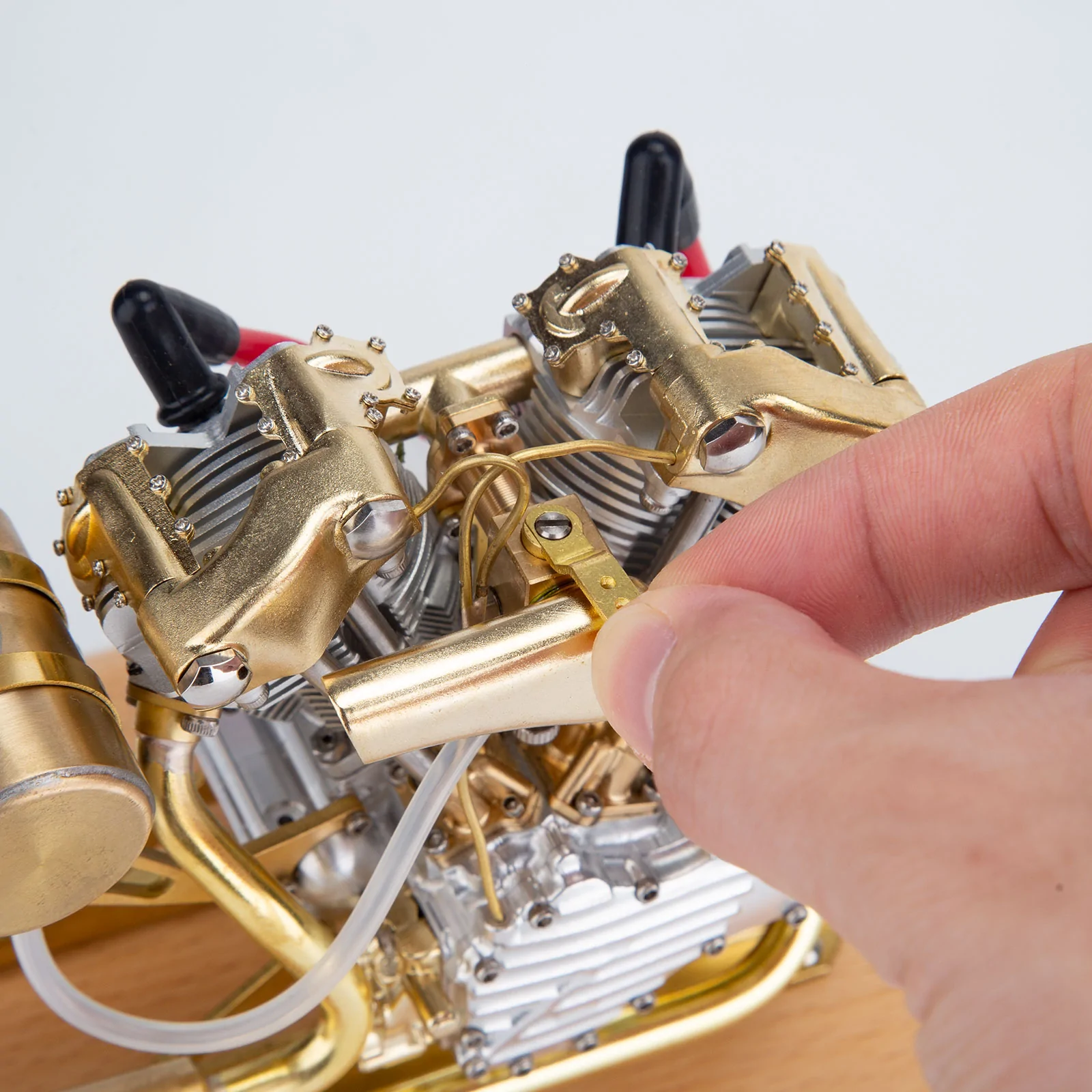 .Each part of the engine was carefully designed, processed as well as made of brass and stainless steel, working in conjunction with a wooden base for easy display&control and stable operation.